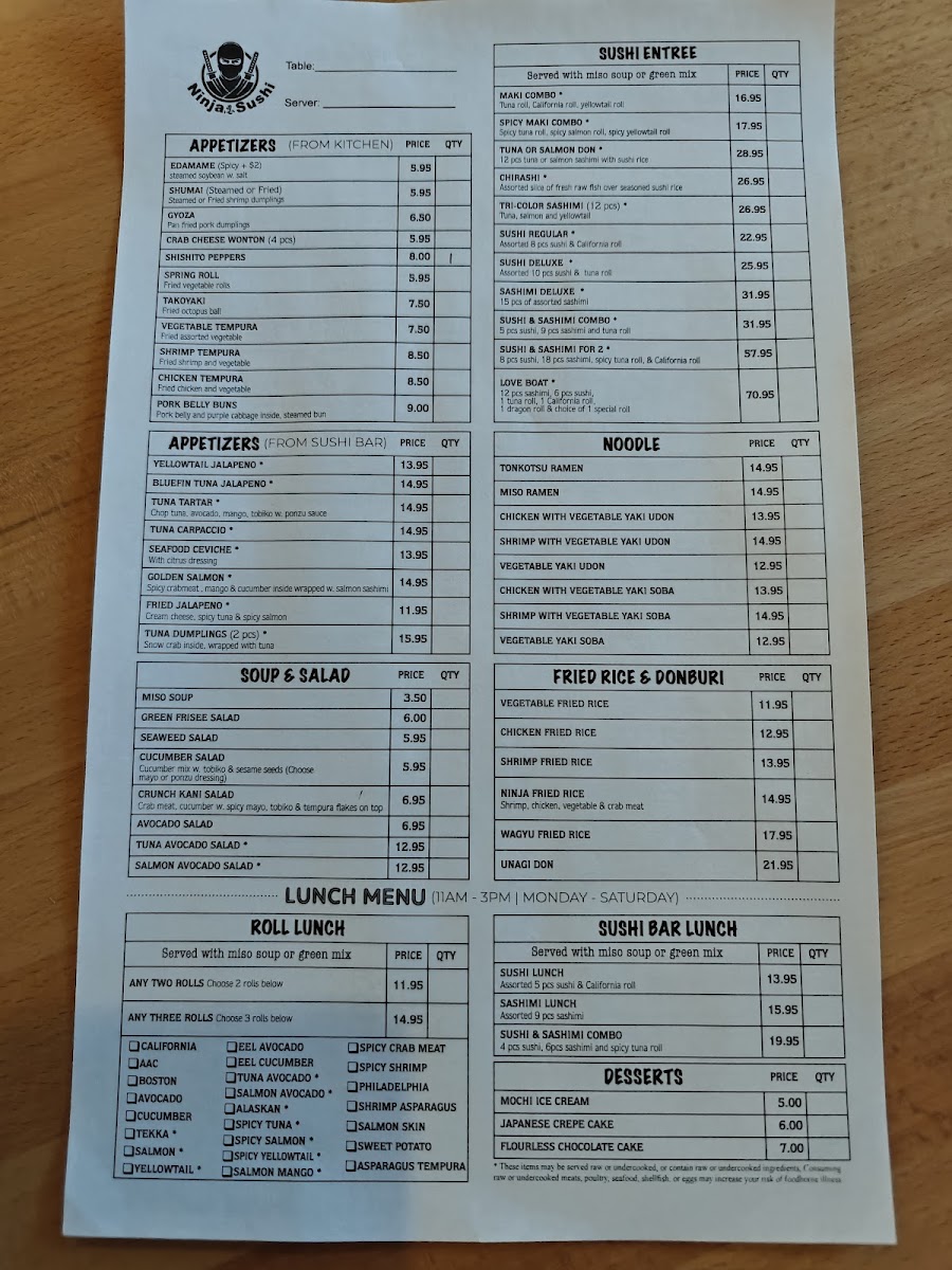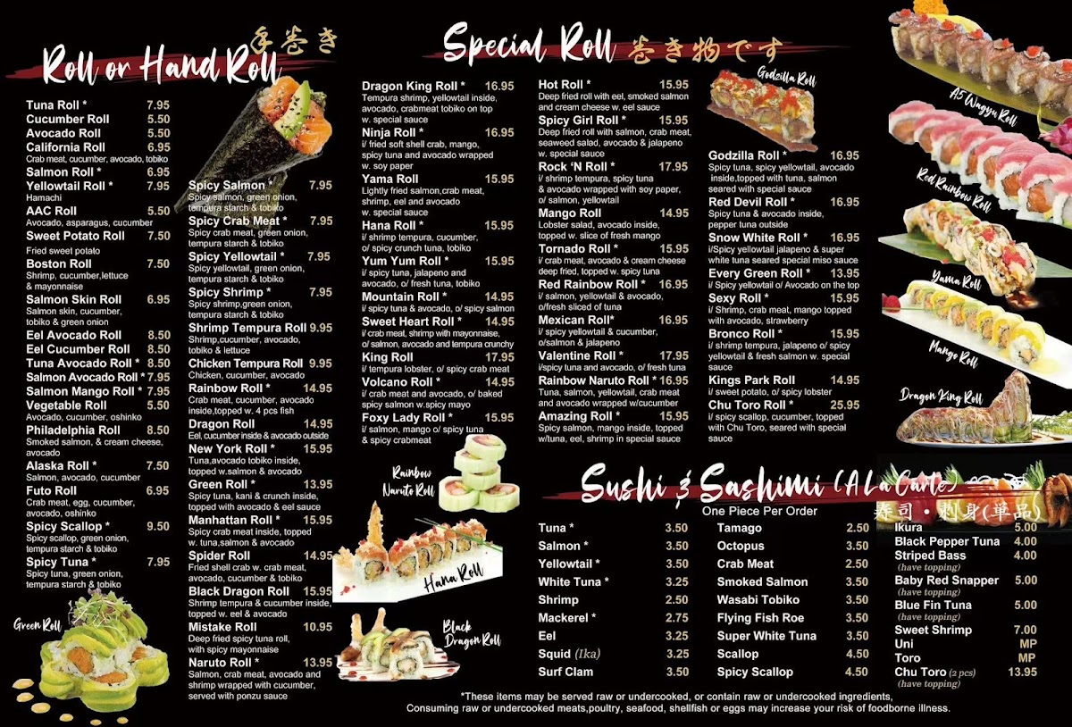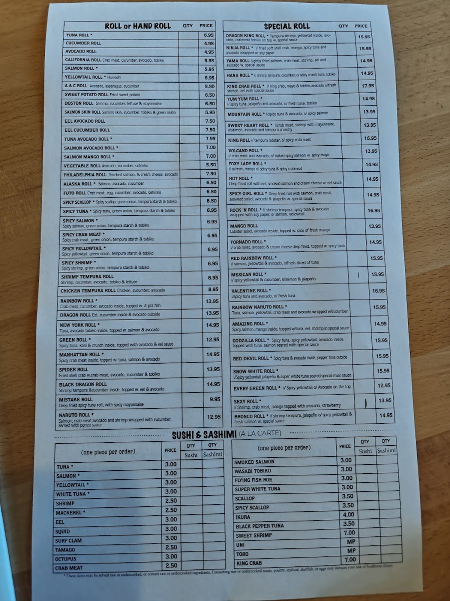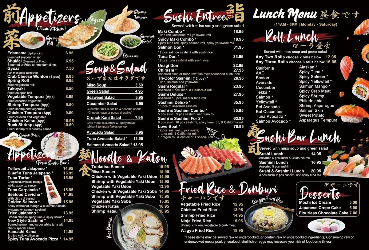 12 pcs sashimi, 6 pcs sushi, 1 tuna roll, 1 California roll, 1 dragon roll & choice of 1 special roll. Served with miso soup and green salad